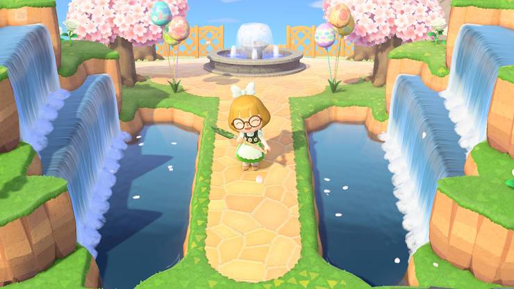 Another great way to find inspiration is to visit a friend's island, which is exactly what beastnunicorn did. The river here looks very interesting, with stone paths that players can jump to in order to traverse the rapids. The double waterfall absolutely breath-taking as well, a testament to great terraforming. Paired with all the cherry blossoms, sometimes all an island needs is just a bit of simple terraforming rather than a whole bunch of decoration objects.