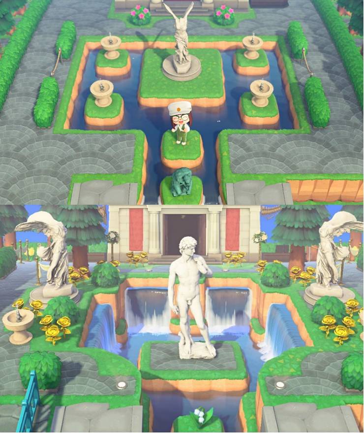 Reddit user 99accy99 has implemented a classic, fancy garden look all around her museum. The terraforming is very impressive as well, with the statue sat in the middle on its very own pedestal. Blathers would be really touched by this design if he ever walked out of the museum to see it!